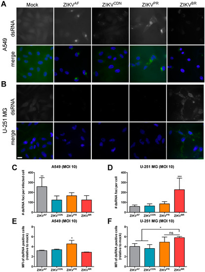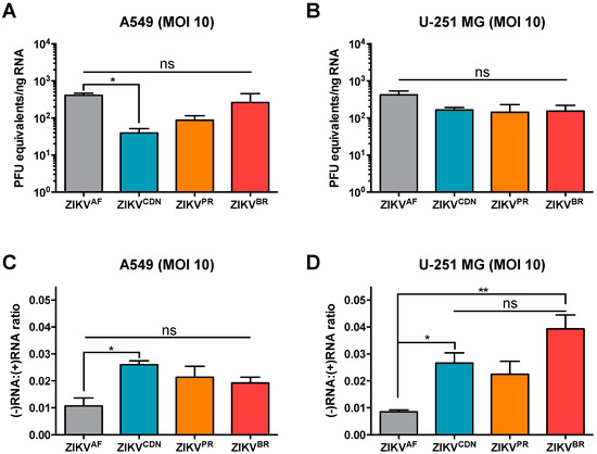 Next, we wanted to determine the relative amount of the replicative intermediate, negative-strand vRNA (Figure 5C,D). Interestingly, on average ZIKVAF produced approximately one copy of negative-strand intermediate vRNA for every 100 positive-strand vRNAs in both A549 and U-251 MG cells. In contrast, the Asian lineage isolates produced 1.9 to 2.6 negative strands for every 100 positive-strand vRNAs in A549 cells, and 2.2 to 3.9 negative-strands for every 100 positive strands in U-251 MG cells. This indicates that approximately 1.8 to 4.5-fold more negative-strand intermediate RNA is produced during infection with Asian lineage isolates when compared with ZIKVAF. Taken together, this data suggests that the Asian lineage isolates are able to produce more negative-strand intermediate vRNA than the African lineage isolate, and that the contemporary isolates, particularly ZIKVBR, induce more dsRNA in U-251 MG cells.