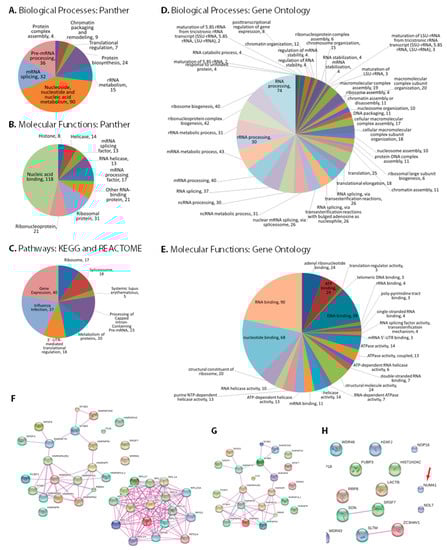 Pathway analyses of NS1 interacting host factors. DAVID-Panther analyses of (A) biological processes, (B) molecular functions and (C) reactome and Kyoto Encyclopedia of Genes and Genomes (KEGG) pathways. Gene Ontologies of (D) Biological processes and (E) Molecular functions. STRING analyses of NS1-interacting proteins in (F) Gene expression pathway, (G) Processing of capped intron-containing pre-mRNA pathway, and (H) Spliceosome pathway. Additional interacting protein networks are shown in Supplementary Figure S1A–D and a STRING interaction network of all 183 identified proteins is shown in Supplementary Figure S1E.