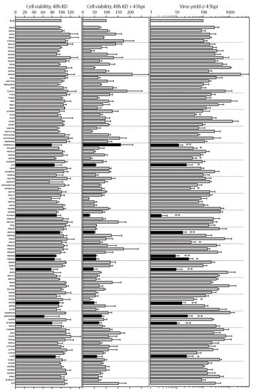 Genetic knockdown of candidate genes by siRNA array screen. Reverse transfections of indicated genes in A549 cells grown in 96-well plates were checked for cell viability with WST-1 at (A) 48 h after knockdown, and (B) after knockdown and PR8 infection at multiplicity of infection (MOI) = 0.05 for an additional 43 h. (C) Virus yields from PR8 infection after MOI = 0.05 infection at 43hpi were determined by plaque assay on canine kidney (MDCK) cells. All values were normalized to the corresponding non-silencing (N-Si) controls, which were set as 100%. Error bars represent standard error of the mean (SEM) from three independent replicates. *: p < 0.05; **: p < 0.005. The 11 genes, knockdown (KD) of which significantly reduced the infectious virus production to between 2.6–30% of the N-Si controls, are depicted as black bars, and cell viabilities after 91 h of knockdown, and the ratios of virus production to cell viability for these 11 genes are shown in Supplementary Figure S2.