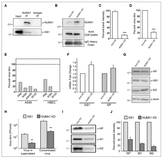 Characterizations of protein, RNA, and infectious virus production in NUMA1 KD cells. (A), Upper panel: confirmation that NUMA1 is immunoprecipitated and recognized by α-NUMA1 antibody in Western blot. NUMA1 could not be detected in non-concentrated cell lysates. Cell lysates were prepared from P100 dishes of A549 cells, reacted with Dynabeads to which α-NUMA1 Abs had been coupled, and ½ of the reaction dissolved in SDS-PAGE sample buffer, resolved in 10% SDS-PAGE, proteins transferred to Immobilon-P PVDF membranes, and probed with α-NUMA1 antibody. Lower panel: Cell extracts prepared from P100 dishes of A549 cells infected with PR8 at MOI = 5 PFU/cell were probed for NS1 prior to immunoprecipitation (Input; 30 µg), or were immunoprecipitated with beads to which NUMA1 or an irrelevant isotype control antibody had been bound. Co-precipitated products were resolved by SDS-PAGE and blots were immunoprobed with α-NS1 antibody. (B) Confirmation of NUMA1 KD efficiency in A549 cells. Sets of P100 dishes were treated with 25 nM of non-silencing (N-Si) control or with NUMA1-specific siRNA twice, 24 h apart for a total of 48 h treatment. Cell extracts were prepared and a 1/40th dilution probed for β-actin to confirm equivalent starting amounts (middle panel). Extracts were then immunoprecipitated with α-NUMA1-Dynabeads. After washing, beads were dissolved in SDS-PAGE sample buffer, proteins resolved by SDS-PAGE, and immunoprobed for NUMA1 (upper panel) or IgG heavy chain (lower panel). (C) Densitometry confirms NUMA1 was knocked down to ~16% of N-Si levels. (D) Percentages of infectious virus production from NUMA1 A549 KD cells compared to N-Si cells. Cells were infected at MOI of 0.05 and harvested at 43 hpi for plaque assay. (E) Percentages of indicated infectious IAV produced from NUMA1 KD A549 and HBEC cells compared to N-Si cells at 43 hpi after MOI = 0.05 infection. The horizontal dashed line at 100% corresponds to each virus’ yield from matching N-Si cells. (F) mRNA levels of NS1 and of NP in A549 cells infected with PR8 at MOI = 5. NUMA1 KD and N-Si cell lysates were quantified by real-time RT-PCR and normalized to both 18S RNA and to NUMA1 quantities produced in the N-Si cells. (G) Cell extracts prepared from N-Si- and NUMA1 KD-infected cells were immunoprobed with the indicated viral proteins (right) or with actin. (H–J) Analyses of infected supernatants from N-Si or NUMA1 KD cells, before ultracentrifugal concentration (H; left-most pair of bars) or after concentration (H; rightmost pair of bars, and I and J). Concentrated viruses were tested for infectivity (H) and immunoprobed for indicated structural proteins (I). (J) Densitometry confirms NUMA1 KD cells produce particles with ~20–40% protein content compared to N-Si cells. Error bars represent SEM from two independent replicates. *: p < 0.05; **: p < 0.01; ***: p < 0.001.