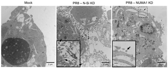 Ultrastructural examination of Mock-infected, and of PR8-infected N-Si and NUMA1 KD cells at 20 hpi after MOI = 3 infection. Mock-infected, and N-Si and NUMA1 KD PR8-infected, A549 cells were harvested, processed with EM Grade Karnovsky fixative and stained with uranyl acetate. All processed samples were analyzed with a Philips CM-10 electron microscope by the histology lab, Department of Human Anatomy. Numerous ~100 nm particles appear to be budding from infected N-Si KD cells (black arrows, center panel) whereas virus production was significantly reduced in PR8-infected NUMA KD A549 cells (right panel). Boxed regions are enlarged in the lower left insets and scale bars for the micrographs, and for the insets, are indicated.