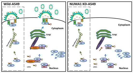 We propose a model illustrating the role of NUMA1 in IAV maturation (Figure 7), in which the viral M1-RNP complexes transport from the nucleus into the cytoplasm and M1 interacts with NS1.