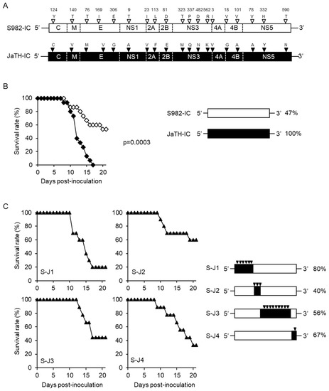Mortalities of mice infected with recombinant viruses inserting point mutations. (A) Survival curves and mortality rates of mice infected with 104 pfu of S-JC1243a (n = 10) and S-JM1403a (n = 10) viruses based on S982-IC containing genome region 3a of JaTH-IC, in which amino acids C124 and M140 were replaced with those of JaTH-IC, respectively. (B) Survival curves and mortality rates of mice infected with 104 pfu of S-J1aNS3323 (n = 5), S-J1aNS3337 (n = 8), S-J1aNS3482 (n = 10), S-J1aNS3562 (n = 5), S-J1aNS4A3 (n = 10), and S-J1aNS4B18 (n = 5) viruses based on S982-IC containing genome region 1a of JaTH-IC, in which amino acids NS3323, NS3337, NS3482, NS3562, NS4A3, and NS4B18 were replaced with those of JaTH-IC, respectively. (C) Survival curves and mortality rates of mice infected with 104 pfu of S-J C124NS3482 (n = 10) virus based on S982-IC, whose amino acid positions of C124 and NS3482 were of JaTH160-IC. Closed triangles indicate recombinant viruses. The black inverted triangles indicate the positions and numbers of amino acids derived from JaTH-IC.