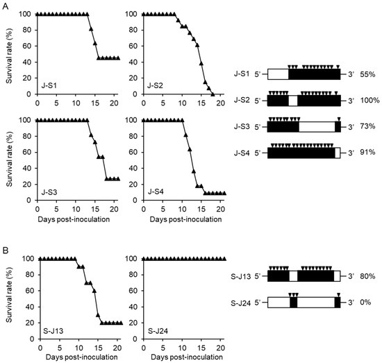 Mortalities of mice infected with recombinant viruses based on S982-IC and JaTH-IC. (A) Survival curves and mortality rates of mice infected with 104 pfu of J-S1 (n = 11), J-S2 (n = 13), J-S3 (n = 11), and J-S4 (n = 11) viruses based on JaTH-IC, in which genome regions 1, 2, 3, and 4 were replaced with those of S982-IC, respectively. (B) Survival curves and mortality rates of mice infected with 104 pfu of S-J13 (n = 10) and S-J24 (n = 10), whose genome regions 1 and 3, or regions 2 and 4, were of JaTH-IC. Closed triangles indicate recombinant viruses. The black inverted triangles indicate the positions and numbers of amino acids derived from JaTH-IC.