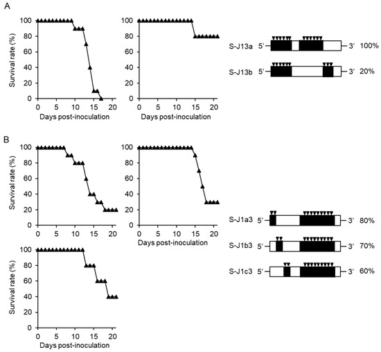 Mortalities of mice infected with S-J13-based recombinant viruses. (A) Survival curves and mortality rates of mice infected with 104 pfu of S-J13a (n = 10) and S-J13b (n = 5) based on S-J13, in which regions 3a (NS336-NS4B110) and 3b (NS4B111-NS5567) were replaced with those of JaTH-IC. (B) Survival curves and mortality rates of mice infected with 104 pfu of S-J1a3 (n = 10), S-J1b3 (n = 10), and S-J1c3 (n = 5) based on S-J13, in which regions 1a (5’UTR-M152), 1b (M153-E303), and 1c (E304-NS1323) were replaced with those of JaTH-IC. Closed triangles indicate recombinant viruses. The black inverted triangles indicate the positions and numbers of amino acids derived from JaTH-IC.