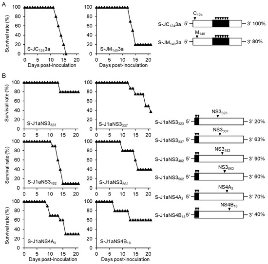 Recombinant viruses of S-J13a and S-J13b were constructed as containing NS336-NS4B110 and NS4B111-NS5567 of JaTH-IC based on S-J1, respectively (Figure 3A). Mortality of S-J13a virus-infected mice was 100%, whereas that of S-J13b infected mice was 20% (Figure 3A). On the other hand, following infections with recombinant viruses of S-J1a3, S-J1b3, and S-J1c3 containing 5’UTR-M152, M153-E303, or E304-NS1323 of JaTH-IC based on S-J3, respectively, mortalities were 80, 70, and 60%, respectively, and S-J1a3 infection showed a higher mortality (Figure 3B).