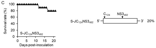 We predicted that simultaneous substitutions of C124 and NS3482 amino acids into S982-IC can increase mortality in mice. Therefore, to determine whether amino acids C124 and NS3482 of JaTH160 are responsible for the high mortality in mice, we inserted point mutations as containing C124 and NS3482 of JaTH160 based on S982-IC (S-JC124NS3482) and examined the mortality in virus-infected mice (Figure 4C). However, this virus infection resulted in 20% mortality in mice (Figure 4C).