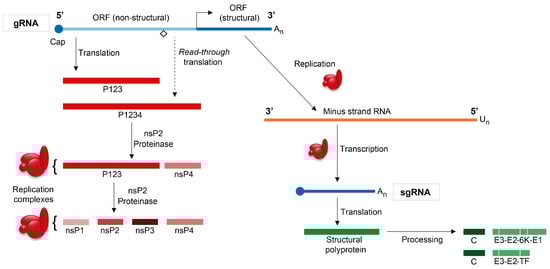 - Rupp, J.C.; Sokoloski, K.J.; Gebhart, N.N.; Hardy, R.W. Alphavirus RNA synthesis and non-structural protein functions. J. Gen. Virol. 2015, 96, 2483–2500. [Google Scholar] [CrossRef] [PubMed]
