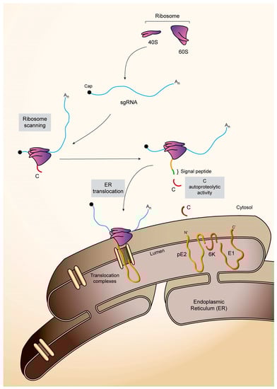 Schematic representation of SINV sgRNA translation to render structural proteins C (capsid)-E3-E2-6K-E1. The sgRNA coding sequence is flanked by two untranslated regions (UTRs): 5′-UTR, which contains a cap structure at its 5′ end, and 3′-UTR, which ends in a poly-(A) tail. The structural proteins are initially synthesized as a polyprotein. Ribosomes scan the capped sgRNA up to the first AUG and translation begins. First, C is synthesized and released from the polyprotein by autoproteolysis. The new N-terminus of the nascent polyprotein chain has a signal peptide for translocation to the endoplasmic reticulum (ER). Translation of the sgRNA continues, associated with the ER membranes, giving rise to the synthesis of the three glycoproteins E3, E2 and E1 and the viroporin 6K. The pE2 glycoprotein is synthesized across the ER membrane, where a carbohydrate attachment site may be responsible for the retention of the signal sequence in E2. The translocation of the glycoproteins across the ER membrane is regulated by various signal sequences. The glycoproteins and 6K are processed and cleaved by cellular proteases of the host vesicular system. Once the pE2–E1 heterodimer complex reaches the trans-Golgi, pE2 is cleaved by furin to form E3 and E2. The cleavage of pE2 is required to generate infectious particles.