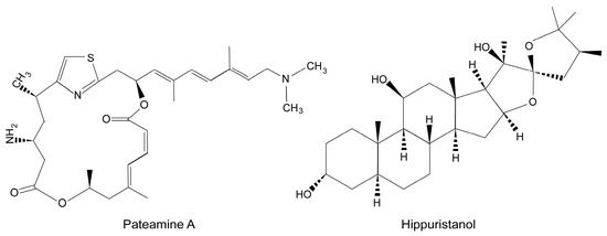 Chemical structure of pateamine A and hippuristanol.