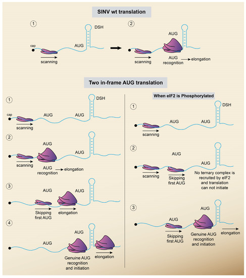 As mentioned earlier, SINV infection induces the phosphorylation of eIF2α leading to its inactivation via activation of PKR by dsRNA. Several inhibitors such as sodium arsenite, dithiotreitol or thapsigargin can further increase this phosphorylation in SINV-infected cells, from about 80% in untreated cells to virtually 100% eIF2α phosphorylation in treated cells [88]. This finding demonstrated that sgRNA translation did not occur at reduced levels of active eIF2, but rather took place when practically all eIF2 was inactivated. As discussed previously, the hairpin located between 27 and 89 nt downstream from the AUG initiation codon is crucial to translate this mRNA when eIF2α is inactivated [74,86,87,89]. It could be speculated that although the majority of eIF2α is phosphorylated in SINV-infected cells, a small portion of active eIF2 remains in close proximity to the translation machinery at sgRNAs. We evaluated this possibility by generating specific variant SINV sgRNAs containing two in-frame AUG start codons [82] (Figure 5). Curiously, initiation on this artificial sgRNA took place at both AUGs, but each of them was preferentially selected depending on the activity of eIF2. Thus, after eIF2α phosphorylation, translation on one AUG was reduced, while the initiation codon closest to DSH was resistant to this inhibition. This result shows that on a single mRNA, one AUG requires active eIF2 whereas the second one, which is at a short distance to the first AUG, initiates translation in an eIF2-independent manner.