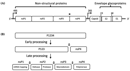 (A) Schematic representation of the alphavirus genome showing the RNA sequence open reading frames (ORFs). The (*) indicates the position of opal termination codon; (B) schematic representation of non-structural polyprotein (nsP2) processing by nsP2 protease. Early processing of P1234 produces P123 and nsP4 which associate to form the early replication complex (RC), which performs negative-sense RNA synthesis. P123 is further processed to produce the individual nsPs, which associate to form mature RC that regulates positive-sense RNA synthesis and transcription of subgenomic 26S RNA.