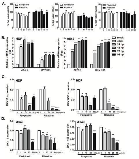 Zika virus (ZIKV) replication efficiency in favipiravir and ribavirin-treated human dermal fibroblasts (HDFs) and A549 cells. (A) HDFs, A549, and Vero cells were treated with various doses of favipiravir (μM), or ribavirin (μg/mL) and incubated for 24 h. At the end of incubation, cell viability was determined using MTT assays. Each value represents the mean ± SEM (n = 4). (B) HDFs and A549 cells were infected with ZIKV at MOI of 1 for indicated times. ZIKV E and NS5 expressions are shown. * p < 0.05; ** p < 0.01; *** p < 0.001, compared with mock control. (C) HDFs and (D) A549 cells were infected with ZIKV at MOI of 1 and treated with either a DMSO control (0 μM), favipiravir (1, 10, 25, and 50 μM), or ribavirin (1, 10, 25, and 50 μg/mL) for 24 h. qRT-PCR was performed to measure ZIKV E and NS5 mRNA levels. The expression of viral transcripts was calculated in relation to the expression level of GAPDH mRNA and expressed as fold-changes relative to expression levels in DMSO control-treated cells. * p < 0.05; ** p < 0.01; *** p < 0.001, compared with DMSO control-treated cells.