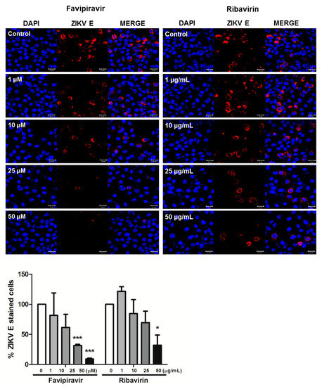 Favipiravir or ribavirin treatment resulted in reduced ZIKV E protein expression. A549 cells were infected with ZIKV (MOI-5) and treated with either DMSO control (0 M), favipiravir (1, 10, 25, and 50 μM), or ribavirin (1, 10, 25, and 50 μg/mL) for 72 h post infection. The ZIKV envelope (E) protein was immunostained with an anti-pan-flavivirus envelope monoclonal antibody. ZIKV E is indicated in red and cell nuclei are stained blue. The images are representative of three independent experiments. Magnification shown is 400 × and the scale bar represents 20 μm. % ZIKV E-stained cells were calculated and the graph represents an average of three independent experiments. * p < 0.05; *** p < 0.001.