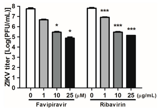 ZIKV infectivity titers following treatment with favipiravir and ribavirin. Vero cells were infected with ZIKV at MOI of 1 and treated with either a DMSO control (0 μM), favipiravir (1, 10, 25, and 50 μM), or ribavirin (1, 10, 25, and 50 μg/mL) for 24 h. Viral replication was determined using plaque assay on cultured supernatants of ZIKV-infected Vero cells. Data are representative of three independent experiments, and each was performed in duplicate. Error bars represent the standard deviation of three biological replicates. * p < 0.05; *** p < 0.001, compared with DMSO control-treated cells.