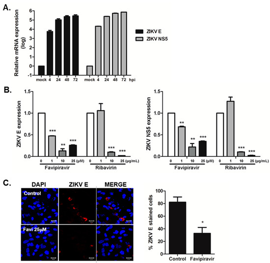 Recent studies have shown that ZIKV can infect neuronal progenitors, neurospheres, and organoids derived from human induced pluripotent stem cells (iPSCs) or embryonic stem cells [26,27,28]. To assess the anti-viral activity of favipiravir and ribavirin in hNPCs, we first generated human neuronal progenitor cells (hNPCs). Similar to previous studies, hNPCs were highly susceptible to ZIKV infection (Figure 4A). Then, we measured the transcript levels of ZIKV E and NS5 in the presence of favipiravir or ribavirin. At 24 h post infection, there was a significant dose-dependent reduction in viral ZIKV E and NS5 transcript levels, suggesting that favipiravir and ribavirin can suppress viral gene expression in hNPCs (Figure 4B). This was confirmed at the protein level by reduced ZIKV E staining in favipiravir-treated hNPCs at 72 h post infection (Figure 4C).