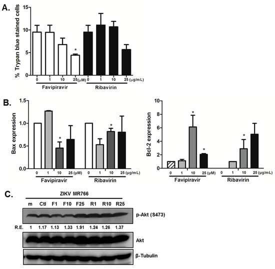 To characterize the effects of favipiravir on neuronal cell death, we compared the percentage of trypan blue-positive stained cells in control (DMSO treated) versus favipiravir or ribavirin treated ZIKV-infected cells. We demonstrate that treatment with 25 μM favipiravir resulted in a significantly decreased proportion of cells positive for trypan blue staining (Figure 6A). We next assessed whether this decrease in neuronal cell death involved modulation of cell growth or apoptosis signaling. We observed that the expression of the anti-apoptotic factor B cell lymphoma 2 (BCL2), and pro-apoptotic factor Bcl-2 associated X protein (BAX), changed following favipiravir and ribavirin treatment. There was a significant increase in BCL2 mRNA levels, whereas BAX mRNA levels decreased after favipiravir and ribavirin treatment (Figure 6B). Furthermore, phosphorylation of AKT was increased in the presence of favipiravir compared to control-treated ZIKV-infected cells (Figure 6C). Therefore, it is likely that favipiravir treatment attenuates ZIKV-induced cell apoptosis in hNPCs via modulation of apoptosis-regulatory genes and promotes survival signaling via the PI3K/AKT pathway.