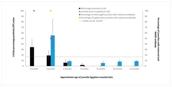 Mean maternal anti-Marburg virus (MARV) IgG antibody levels in juvenile bats born from naturally exposed mothers, with error bars representing the standard deviation of the measurements. ELISA results are shown as the percentage positivity (PP) in relation to the positive control serum. The dashed grey line represents the cut-off value of the assay at 16.8 PP (left-hand y-axis). The percentage of juveniles with maternal anti-MARV antibodies is displayed on the right-hand y-axis.
