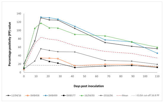 Six MARV-naive ERBs were inoculated subcutaneously with 100 µL of tissue culture supernatant containing 105.3/mL tissue culture infectious dose (TCID50) of MARV (isolate SPU 148/99/I Watsa, second passage in Vero cells). The bats were clinically monitored and bled over a period of 110 days as previously described [13,15]. Sera were tested for anti-MARV IgG antibodies using I-ELISA as previously described [15].