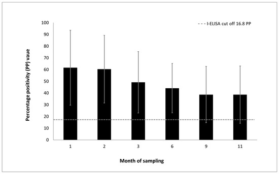 Mean duration of the IgG immune response to Marburg virus in previously naturally exposed Egyptian rousette bats (n = 38), with error bars representing the standard deviation of the measurements. ELISA results are shown as the percentage positivity (PP) in relation to the positive control serum. The dashed grey line represents the cut-off value of the assay at 16.8 PP.