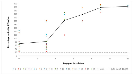 There were no apparent signs of morbidity or mortality in any of the MARV-inoculated or control bats for the duration of the experiment. There was a statistically significant difference between the ELISA PP values of naive [15] and seropositive bats both before (two-tailed p-value: 0.00001), and after inoculation with MARV (two-tailed p-value: 0.0002). A substantial boosting effect of MARV infection on the anti-MARV GP IgG levels was noted in the MARV-inoculated bats from day 5 p.i. (Figure 4). The anti-MARV IgG levels in control bats remained unchanged for the duration of this study.