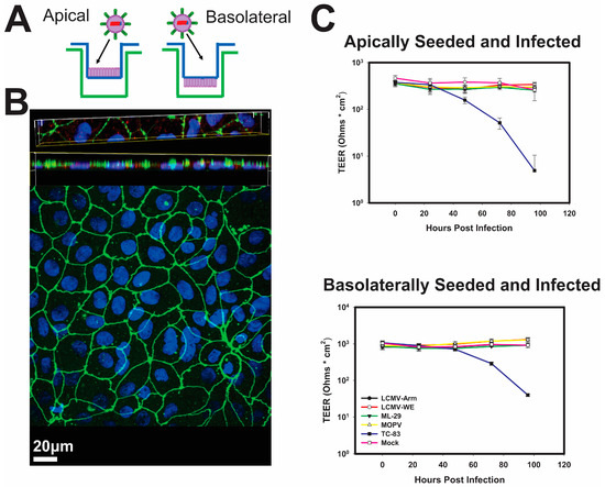 Polarized Caco-2 cells were infected either apically, or basolaterally, with an MOI of 0.3 PFU/cell of the corresponding viruses: LCMV-Arm, LCMV-WE, MOPV, or ML-29. Wells and inserts were washed two times with DMEM without phenol red. To each insert, virus was added, and 1 mL of DMEM without phenol red was to each well. Infection was carried out for 1 h at 37 °C in 5% CO2. After this period, the inserts and wells were washed two times with 1x DPBS (Invitrogen), and 1 mL of nutrient media was added to each well and 0.5 mL was added to each insert chamber. Cells were maintained at 37 °C in 5% CO2. TEER was measured daily for 5 days, and the tissue culture supernatants from the Transwell inserts and wells were harvested daily and the media was replaced.