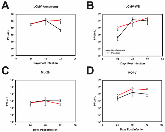 Polarization of Caco-2 cells does not significantly impact OW arenaviral replication. Caco-2 cells were seeded in 96-well plates and polarized for 2 weeks, or plated for 3 days (non-polarized) and infected with either LCMV-Arm (A); LCMV-WE (B); ML-29 (C); or MOPV (D) at a multiplicity of infection (MOI) of 0.3 PFU/cell. Supernatants were collected every 24 h for a 72 h period, and virus production was determined via standard plaque assay. Values shown are the means of 3 biological l replicates with the error bar representing the standard deviation of the mean.