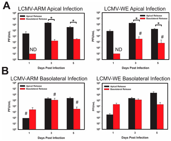 LCMV-Armstrong and LCMV-WE show similar patterns of entry and release in polarized Caco-2 cells regardless of pathogenic differences. Caco-2 cells were polarized on 0.4 µm Transwell inserts in apical or basolateral orientation, for 21 days. After integrity of the monolayer was verified using TEER, the cells were infected with either LCMV-Arm, LCMV-WE, at an MOI of 0.3 PFU/cell on either the apical (A); or basolateral (B) side of polarized Caco-2 cells. Supernatants were collected from both the insert, and well of the Transwells, to determine viral release from the apical or basolateral surfaces independent from one another. Viral titer was measured using standard plaque assay. Release from the Apical surface (black) and the Basolateral surface (red) is plotted with respect to time, with initial viral load subtracted. Values shown are the means of 3 biological replicates with the error bar representing the standard deviation of the mean. If viral plaque forming units (PFUs) were not observed, data received a place-holder value to signify samples were tested, but no data (ND) was collected. # indicates that one or more biological replicates was below limit of detection. * p-value ≤ 0.05.