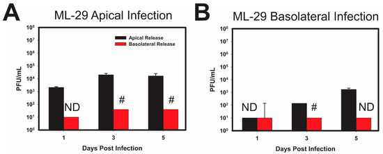 ML-29 replication in polarized Caco-2 cells differ from the replication patterns of LCMV. Caco-2 cells were polarized on 0.4 µm Transwell inserts as stated for Figure 3. Cells were then infected on the apical (A) or the basolateral (B) surface of the cells with an MOI of 0.3 PFU/cell of reassortant vaccine candidate ML-29. Supernatants were collected from transwells and inserts to determine viral release from the apical or basolateral surfaces independent of one another, on every day for 5 days. Release from the Apical surface (black) and the Basolateral surface (red) is plotted with respect to time, with initial viral load subtracted. Values shown are the means of 3 biological replicates with the error bar representing the standard deviation of the mean. If viral PFUs were not observed, data received a place-holder value to signify samples were tested, but no data (ND) was collected. # indicates that one or more biological replicates was below limit of detection. * p-value ≤ 0.05.