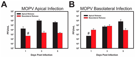 Parallel analysis of MOPV infection reveals a pattern of viral release similar to that observed for LCMV. As shown in (Figure 5A), the apical infection of polarized Caco-2 cells primarily resulted in the release of infectious viral particles from the apical surface; however, basolateral release was observed. Similar to LCMV, and different from ML-29, basolateral infection of polarized Caco-2 cells resulted in the more-or-less equivalent release of viral progeny apically and basolaterally.