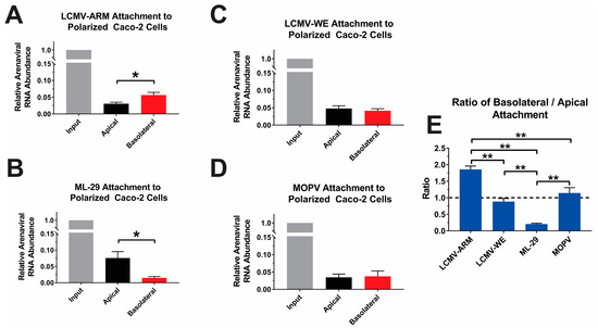 Attachment of ML-29 on the basolateral surface of polarized Caco-2 cells is significantly lower than apical attachment. Caco-2 cells were polarized on 0.4 µm Transwell inserts for 21 days in either apical or basolateral orientation. Cells were then infected with an MOI of 0.3 PFU/cell of LCMV-Arm (A); LCMV-WE (B); ML-29 (C); or MOPV (D) at 4 °C for 1 h to allow virus to attach to the epithelial cell surfaces, but not enter the cells. After 1 h, cells were either unwashed (input) or washed and cellular RNA and supernatants were collected for quantitative real-time polymerase chain reaction analysis. Ratio of basolateral to apical attachment was taken by dividing basolateral ΔΔCT values of washed cells by the apical ΔΔCT values of washed cells (E). * p-value ≤ 0.05, ** p-value ≤ 0.01.