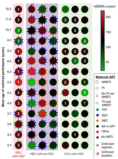 The most commonly used individual ARVs were lamivudine (44/54, 81%), zidovudine (33/54, 61%), nelfinavir (21/54, 39%), ritonavir-boosted lopinavir (17/54, 31%), and abacavir (14/54, 26%). Notably, 3/14 (21%) HEUs with ASD received no exposure to ARVs in utero, compared to 2/42 (5%) HEUs without ASD (Fisher’s exact p = 0.094). However, HEU children with ASD had a shorter duration of exposure to maternal ART than HEUs without ASD (11 vs. 33 weeks, Table 2) and consequently may have experienced greater exposure to maternal HIV “milieu”. A visual representation relating mtDNA content, maternal ART parameters, and ASD severity is shown in Figure 1.
