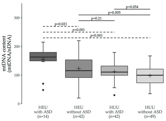 Between-group comparisons of blood mtDNA content in HIV-exposed uninfected (HEU) and HIV-unexposed uninfected (HUU) children with and without ASD. p-Values are reported for Student’s t-test (solid lines) or Mann-Whitney U-test (dashed lines).