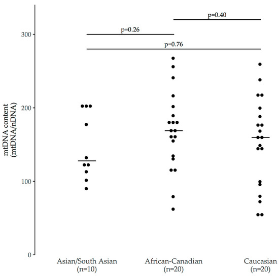 There were no significant mtDNA content differences observed between any of the three groups (p = 0.26 to 0.76, Figure 3). We used Cohen’s d as an estimate of effect size between groups (power = 0.80, α = 0.05). We found that between Caucasian and Asian/South Asian children (d = 0.12), a sample size of n = 1177 in each group would provide 80% power to detect a difference in mtDNA content. Similarly, between African-Canadian and Caucasian children (d = 0.27), group sizes of n = 216 each would be required, and between Asian/South Asian and African-Canadian children (d = 0.44), group sizes of n = 83 each would be required. Notably, the African-Canadian and Caucasian groups had median values similar to those of HEU children with ASD (median [IQR]: 163 [150 to 180]).