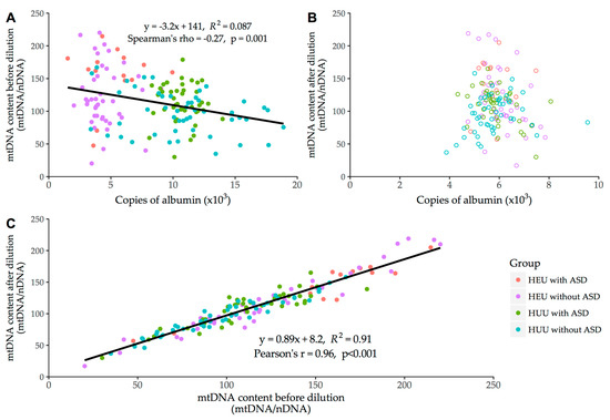 Correlation of mtDNA content and albumin copy number before (panel A) and after dilution to a common albumin concentration (panel B). Linear correlation of mtDNA content measurements before and after systematic dilution (panel C).