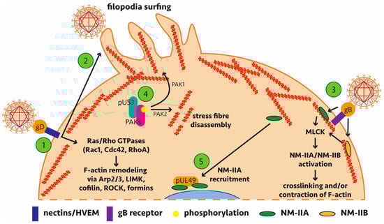 Identified alphaherpesvirus-host interactions involved in actin remodelling or myosin recruitment. This schematic highlights the findings of Table 1 and Table 2, representing the known specific interactions and pathways involved in alphaherpesviral regulation of actin dynamics. 1: Viral envelope glycoprotein gD binds nectins and/or the herpesvirus entry mediator (HVEM) to activate Ras/Rho GTPases. This triggers actin remodelling via the Arp2/3 complex, LIM domain kinases (LIMK), cofilin, Rho-associated protein kinase (ROCK) and formins. 2: gD binding to surface receptors can trigger the formation of filopodia. The virus can associate with these and undergo “surfing” to bring the virus closer to the main body of the cell for entry. 3: Non-muscle myosins, NM-IIA and NM-IIB, can act as entry coreceptors for viral envelope glycoprotein gB, activated by upstream myosin light chain kinase (MLCK) activation, leading to remodelling of F-actin. 4: Viral kinase pUS3 phosphorylation of the p21-activated kinases (PAKs) can lead to formation of protrusions (PAK1) and stress fibre disassembly (PAK2). 5: Viral protein pUL49 can sequester a subpopulation of NM-IIA at the perinuclear space which may rearrange actin for viral nuclear egress.