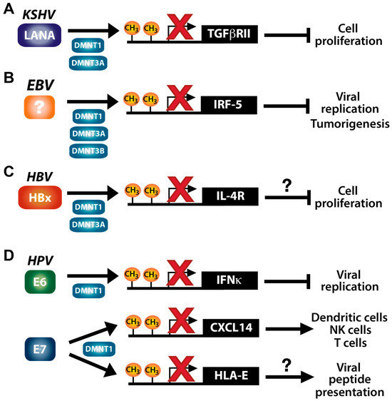 Hijacking DNA methylation machinery by DNA tumor viruses is likely a viral mechanism to promote virus replication by evading antiviral immunity. Immune suppression caused by aberrant DNA methylation over time may contribute to cancer development and progression associated with DNA tumor viruses (Figure 1). In fact, tumorigenesis is enhanced when antiviral immune responses are dampened [62,63,64,65] (reviewed in [56]). Kaposi’s sarcoma-associated herpesvirus (KSHV; also known as human herpesvirus 8), Epstein-Barr virus (EBV; also known as human herpesvirus 4), HBV, and HPV induce promoter methylation which downregulates expression of host immune-related genes, as will be discussed herein. Although here we focus on DNA tumor viruses, regulation of host immune genes by DNA methylation has also been demonstrated for the RNA virus human immunodeficiency virus (HIV) [66,67,68,69].