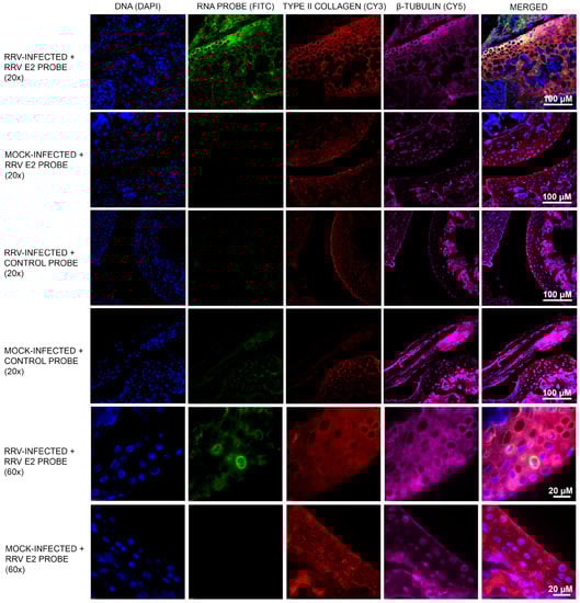 Murine chondrocyte cells are susceptible to Ross River virus (RRV) infection. Chondrocyte cells in the cartilage region of RRV-infected mice were stained positive for RRV envelope 2 (E2) RNA by fluorescence in situ hybridisation (green/FITC). To identify the chondrocyte cells, type II collagen immunostaining was performed to locate the cartilage region (red/Cy3). Tissue sections were also stained to better visualise cell morphology: DNA (blue/DAPI) and β-tubulin (magenta/Cy5). No FITC signal was observed in mock-infected mice. The experiment was also performed using a negative control probe to rule out any non-specific RNA probe binding. Images were captured at 20× and 60× magnifications.