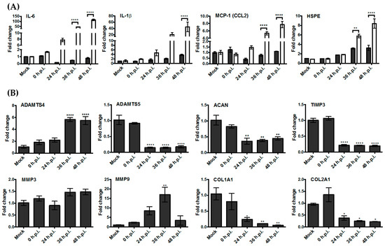 Upregulation of key pro-inflammatory genes and extracellular matrix breakdown genes during Ross River virus (RRV) infection in human chondrocyte cells (grey) and skeletal muscle cells (white) at 0, 24, 36, and 48 h post-infection (h.p.i.). Samples were normalised using values from mock-infected groups. (A) Relative gene expression of key pro-inflammatory markers. Statistical analysis was performed by two-way ANOVA statistical analysis with Bonferroni’s test. (B) Relative gene expression of articular cartilage components and associated breakdown markers. Statistical analysis was performed by one-way ANOVA followed by Dunnett’s multiple comparisons test. * p < 0.05, ** p < 0.01, **** p < 0.0001.