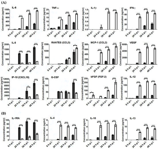 Soluble mediators present during Ross River virus (RRV) infection in human chondrocytes cells (grey) and skeletal muscle cells (white) primary cells at 0, 24, 36, and 48 h post-infection (h.p.i.). (A) Pro-inflammatory and (B) anti-inflammatory cytokine levels were measured using the Biorad Bio-Plex® multiplex system. Statistical analysis was performed by two-way ANOVA statistical analysis with Bonferroni’s test. * p < 0.05; ** p < 0.01, **** p < 0.0001.