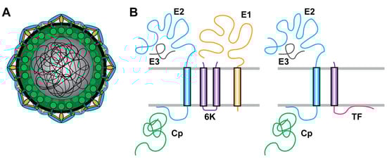 Schematic diagrams of alphavirus structural proteins. (A) Cartoon illustration of an alphavirus particle. E2 (blue) and E1 (orange) assemble into trimers of heterodimers embedded in the viral membrane bilayer (black). E2 directly interacts with capsid protein (green), and capsid protein assembles with the genomic RNA (enclosed dark gray sphere and lines) to form the viral nucleocapsid. Components not to scale; (B) cartoon illustration of the major (left) and minor (right) mature structural protein translation products. E3 is shown in grey, 6K in purple, transframe (TF) in purple and pink, and the other proteins are colored as in (A). Proteins not to scale.