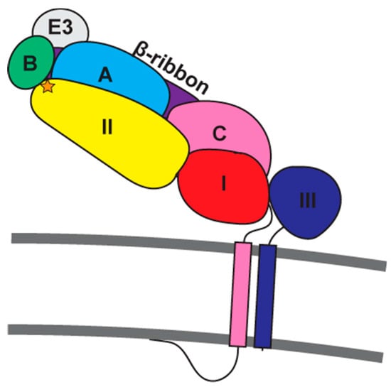 Cartoon illustration of the p62-E1 heterodimer. E3 is shown in light gray. E2 domain A is shown in cyan, domain B in green, domain C in pink, and the B-ribbon connector in purple. E2 subdomain D is not shown. E1 domain I is shown in red, domain II in yellow, and domain III in blue. E1's fusion loop is shown as an orange star. E2 and E1 transmembrane helices are shown as rectangles colored according to their respective preceding domains. The lipid bilayer is depicted as dark gray lines.