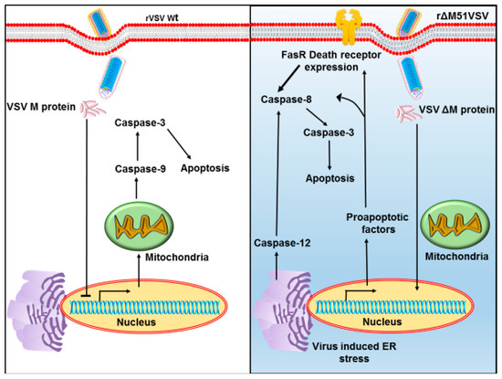 Modified matrix protein is a superior oncolytic agent. The left panel shows the action of wild-type matrix protein and pathways leading to cellular apoptosis. The right panel depicts mutant of matrix protein efficient in apoptosis in cancer cells. ER: endoplasmic reticulum; rVSVwt: recombinant VSV wild type; rΔM51VSV: recombinant VSV with mutation at 51st position in its matrix protein.