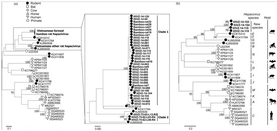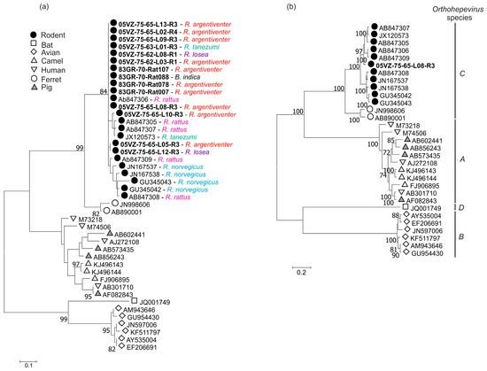 Maximum likelihood trees of (a) the screening fragment and (b) the ORF1 of hepeviruses using the best-fitting models of LG+G+I and LG+G+F, respectively. Rodent species are shown. Labels for sequences obtained in this study are highlighted in bold. Bootstrap support values of ≥ 70% are shown. The trees were drawn to scale; bar, estimated number of substitutions per site.