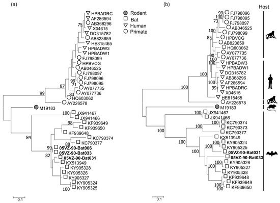 - Drexler, J.F.; Geipel, A.; König, A.; Corman, V.M.; van Riel, D.; Leijten, L.M.; Bremer, C.M.; Rasche, A.; Cottontail, V.M.; Maganga, G.D.; et al. Bats carry pathogenic hepadnaviruses antigenically related to hepatitis B virus and capable of infecting human hepatocytes. Proc. Natl. Acad. Sci. USA 2013, 110, 16151–16156. [Google Scholar] [CrossRef] [PubMed]