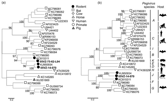 Maximum likelihood trees of (a) the screening fragment and (b) the region 888–1635 of pegiviruses using the best-fitting model of LG+G+I+F. Labels for sequences obtained in this study are highlighted in bold. Bootstrap support values of ≥ 70% are shown. The trees were drawn to scale; bar, estimated number of substitutions per site.