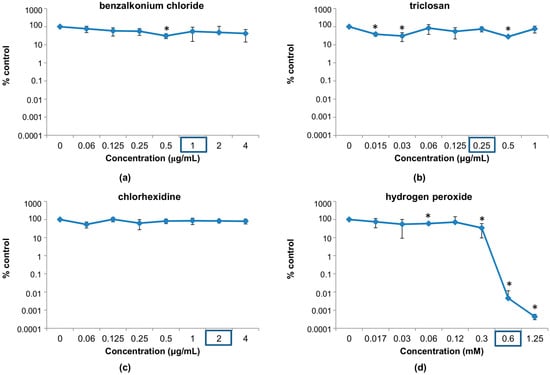 Percentage of survival of phiIPLA-RODI phage particles after overnight treatment with different concentrations of disinfectants: (a) benzalkonium chloride; (b) triclosan; (c) chlorhexidine; (d) hydrogen peroxide compared to an untreated control without disinfectant. The minimal inhibitory concentrations (MIC) for S. aureus IPLA1 for each disinfectant is marked with a blue rectangle. * p-Value < 0.05.