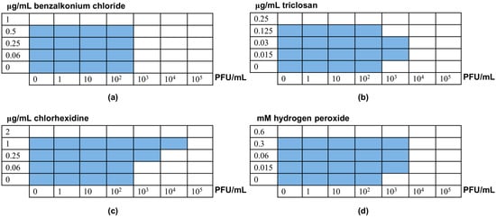 Results of the checkerboard assays to test the interactions between phage phiIPLA-RODI and the following disinfectants: (a) benzalkonium chloride; (b) triclosan; (c) chlorhexidine; (d) hydrogen peroxide. Wells with bacterial growth after 24 h of incubation at 37 °C are marked in blue.
