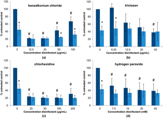 Representation of the data obtained in the biofilm removal assays to test the interactions between a high dose of phage phiIPLA-RODI (109 PFU/mL) and different concentrations of the following disinfectants: (a) benzalkonium chloride; (b) triclosan; (c) chlorhexidine; (d) hydrogen peroxide. Dark blue and light blue bars represent samples without or with phage treatment. Values obtained without phage treatment were compared to those treated with phiIPLA-RODI and p-values < 0.05 were considered significant (*). Additionally, values obtained with disinfectant were compared to the untreated control to determine the antibiofilm effects of the four antimicrobials and p-values < 0.05 were considered significant (#).