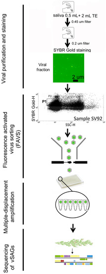 In the human microbiome, single-cell genomics (SCGs) has indeed been key in sequencing the genome for some of the “most wanted prokaryote taxa” [17]. In microbial ecology, the lack of genomic information for predominant microbes hinders our ability to answer fundamental biological questions about microbial communities. Thus, the implementation of complementary techniques to culture and metagenomics that aid in unveiling the extant genomic natural viral (micro)diversity is paramount in closing that gap. Over the last few years, metagenomics has characterized the viral diversity at different body sites [11,18]. The oral cavity represents an excellent model to apply SVGs, since it is one of the most densely-populated habitats of the human body, with ≈108 virus-like particles (VLPs) per mL of saliva [18]. In this study, we demonstrate the feasibility of using SVGs to sequence the genome of uncultured DNA viruses present in human saliva, and we combine the power of viral metagenomics and SVGs to study the human salivary virome.